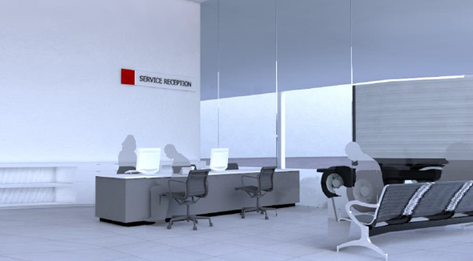 The aim of this service area/service reception is to assist customers with their needs for truck and vehicle repairs, truck purchases, and other Jabar motors services. Its color scheme is predominantly white. Seats are also available for our customers' convenience at the workplace.